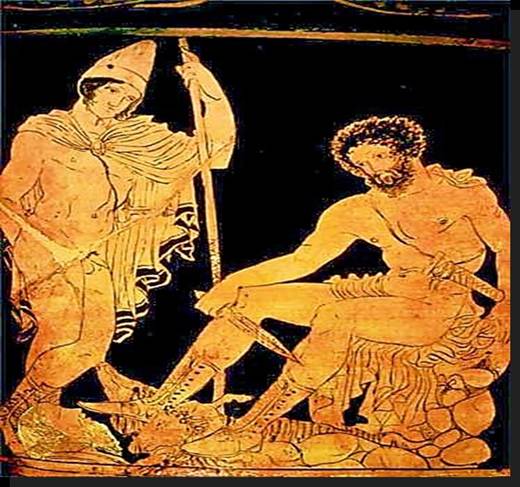 Η παράσταση είναι από κρατήρα του 5ου πΧ αιώνα ο οποίος βρίσκεται στην Bibliothèque Nationale στο Παρίσι. Απεικονίζει τον Οδυσσέα καθισμένο ανάμεσα σε δύο συντρόφους του, τον Ευρύλοχο και τον Περιμήδη (μόνο ο Ευρύλοχος φαίνεται εδώ), να ακούει προσεκτικά τον χρησμό του μάντη Τειρεσία (το κεφάλι κάτω αριστερά) μετά την κάθοδό του στον Άδη (Οδύσσεια, ραψωδία λ’). Ο Τειρεσίας σύμφωνα με μιαν εκδοχή του μύθου βαδίζοντας στον Κιθαιρώνα, όπου είχε πάει για κυνήγι, παρατήρησε δυο φίδια που ζευγάρωναν. Όταν αυτά τού επιτέθηκαν χτύπησε το θηλυκό με το ραβδί του και το σκότωσε. Τότε μεταμορφώθηκε σε γυναίκα και έγινε διάσημη εταίρα. Επτά χρόνια αργότερα περνώντας απο το ίδιο μέρος συνέβη το ίδιο περιστατικό και τότε σκότωσε το αρσενικό φίδι, οπότε και ξαναέγινε άνδρας. Όταν αργότερα ο Δίας και η Ήρα διαφωνούσαν για το ποιός-ο άνδρας ή η γυναίκα-απολαμβάνει περισσότερο την ερωτική πράξη (υποστηρίζοντας ο καθένας ότι την απολαμβάνει περισσότερο το αντίθετο φύλο), αποφάσισαν να ρωτήσουν τον Τειρεσία που είχε την εμπειρία και των δυο φύλων. Τότε ο Τειρεσίας είπε: ‘εάν διαιρέσουμε την ηδονή σε μέρη δέκα, ένα θα έπαιρνε ο άνδρας και εννιά η γυναίκα’. Η Ήρα εξοργισμένη με την ήττα της τύφλωσε τον Τειρεσία και ο Δίας για να τον εξευμενίσει τού χάρισε την αίσθηση να προβλέπει τα μελλούμενα, μετατρέποντάς τον έτσι σε έναν από τους διασημότερους μάντεις της αρχαιότητας. Φαίνεται ότι οι αρχαίοι ήταν πιο ‘άνετοι’ από εμάς με τις μεταβολές των φύλων…(πηγή: Ελληνική Μυθολογία, Εκδοτική Αθηνών)