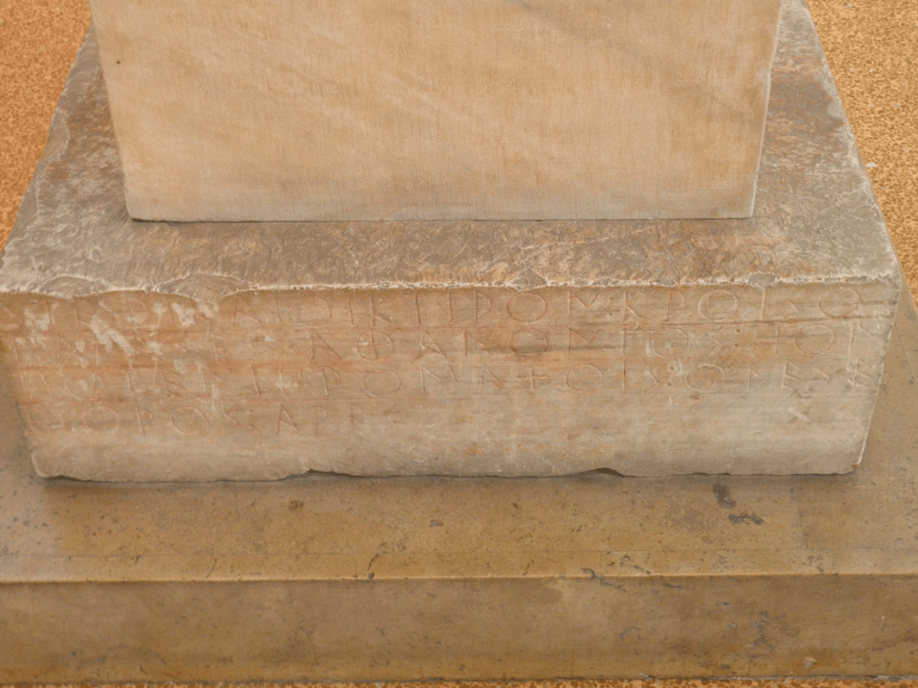 Η επιγραφή αναφέρει “ΣΤΕΘΙ ΚΑΙ ΟΙΚΤΙΡΟΝ ΚΡΟΙΣΟ ΠΑΡΑ ΣΕΜΑ ΘΑΝΟΝΤΟΣ ΗΟΝ ΠΟΤ’ΕΝΙ ΠΡΟΜΑΧΟΙΣ ΟΛΕΣΕ ΘΟΡΟΣ ΑΡΕΣ’ δηλαδή ‘στάσου δίπλα στο σήμα του νεκρού και θρήνησε τον Κροίσο που τον αφάνισε ο τρομερός Άρης καθώς αυτός πολεμούσε στην πρώτη γραμμή της μάχης᾽.