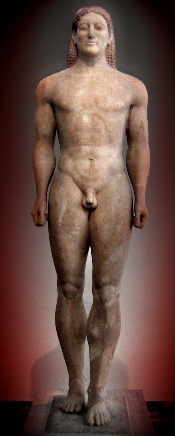 Η φωτογραφία αναπαριστά τον Κούρο Κροίσο ή Κούρο της Αναβύσσου. Πιστεύεται ότι φιλοτεχνήθηκε το 530 πΧ από παριανό μάρμαρο και αποτελούσε ανδριάντα σε ταφικό μνημείο στην νεκρόπολη της Αναβύσσου. Από την επιγραφή στη βάση του μαθαίνουμε ότι το μνήμα ανήκε στον πολεμιστή Κροίσο που έπεσε στην μάχη. Το άγαλμα βρίσκεται στο Αρχαιολογικό Μουσείο Αθηνών.